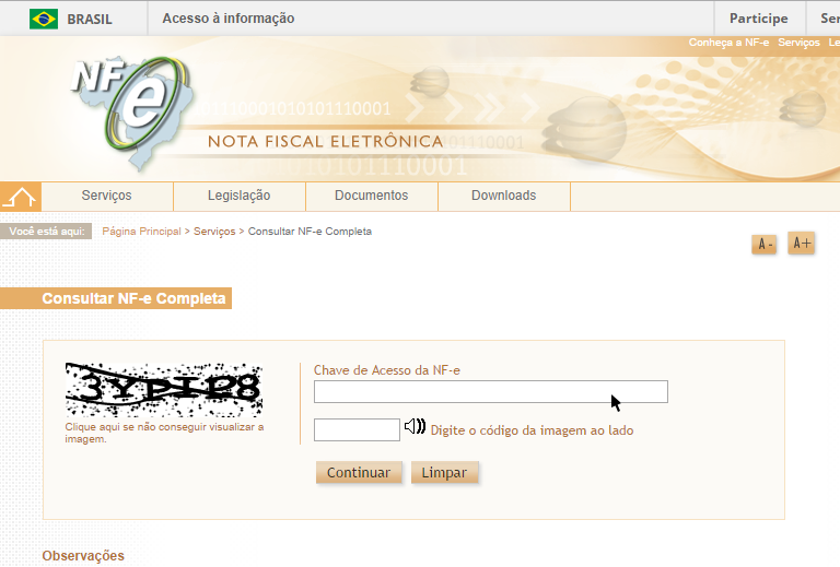 - Acesse o link http://www.nfe.fazenda.gov.br, clique no menu Serviços e em seguida Consultar NFe Completa;