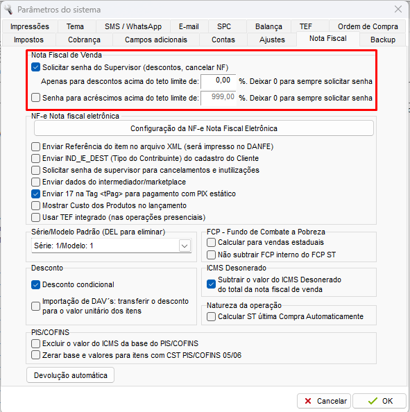 - Marque a opção “Solicitar senha do Superisor (descontos, cancelar NF)”;