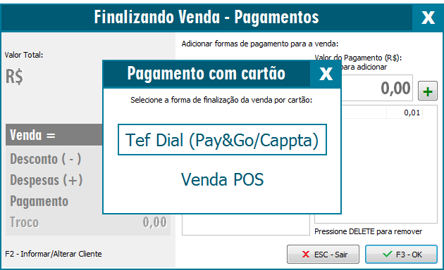 Esta opção é muito utilizada para os casos onde o cliente possui a máquina do cartão (PinPad) mas não possui um sistema de TEF instalado no computador.