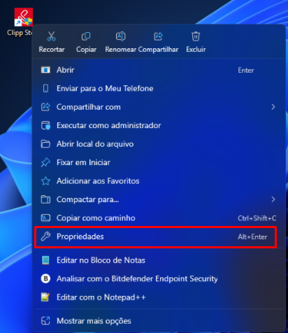 - Clique com o botão contrário do mouse sobre o ícone do Clipp / Propriedades / Localizar destino ou Abrir local do arquivo;
