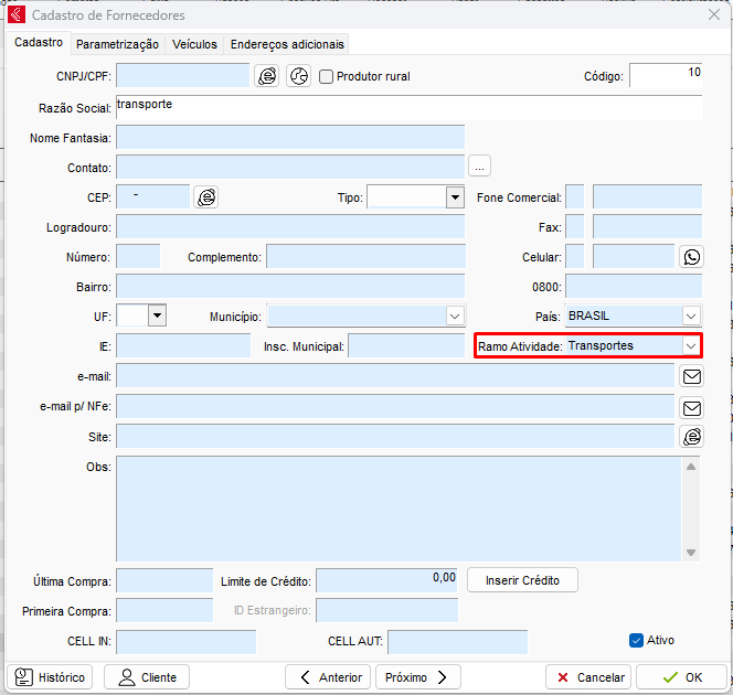 3. Para que o cadastro seja identificado como Transportadora, deve ser selecionado no campo Ramo de atividade a opção Transportes.