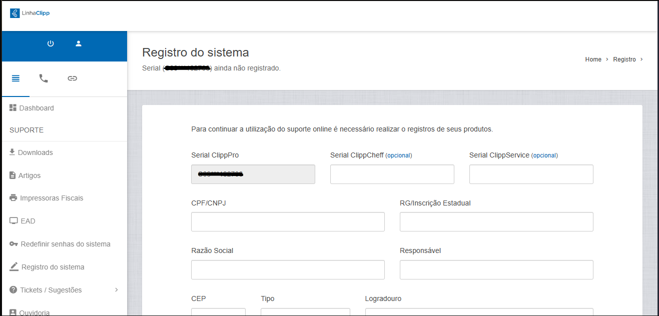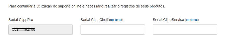 Caso o ClippPro já esteja registrado, poderá realizar o registro de seus sistemas complementares como: ClippCheff e ClippService, basta acessar novamente o endereço: https://suporte.clipp.com.br/registro, informar o serial e fazer o envio.
