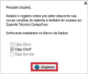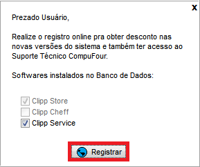 Caso a empresa possuir o Clipp Service ou Clipp Cheff instalado no computador será apresentada a opção para registrar o mesmo, mantenha marcada a opção correspondente ao Módulo Complementar utilizado e clique em Registrar.