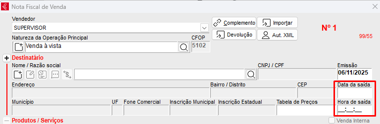 Como lançar uma nota fiscal de venda sem informar data e hora