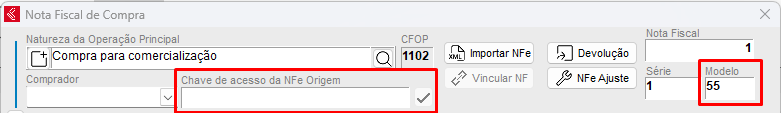 Preencher corretamente o campo Chave de Acesso da NFe Origem dentro da Nota Fiscal de Compra referenciada e o modelo 55.
