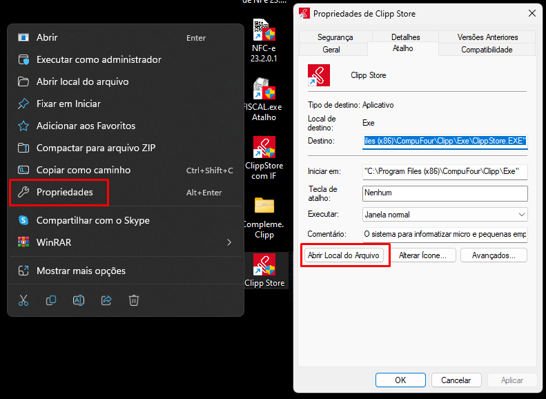 3. Para abrir a pasta clique com o botão contrário do mouse sobre o ícone do Clipp, siga até Propriedades e depois em Abrir Local do Arquivo ou Localizar Destino.