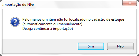 OBS²: Caso tenha deixado de relacionar um ou mais produtos será apresentada a mensagem informando que o item não foi localizado, poderá clicar em Sim para prosseguir ou Não para voltar à tela de Importação.