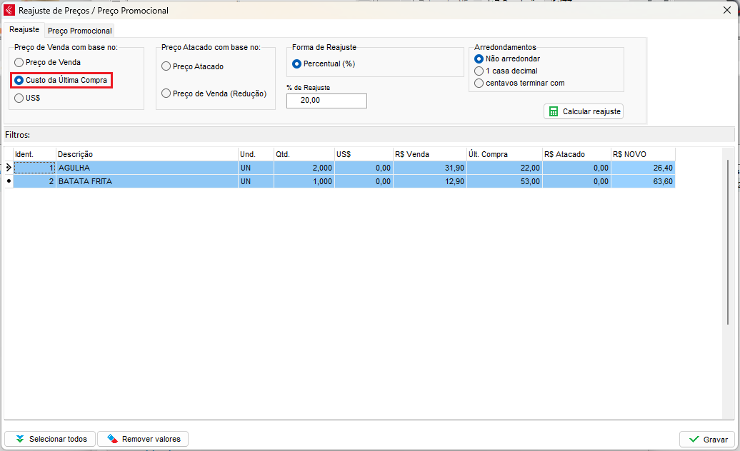 Pressionando Sim abrirá a tela de reajuste de preço. Nela é marcando a opção Custo da Ultima Compra que é possível alterar o preço de venda com base na compra que você acabou de finalizar.