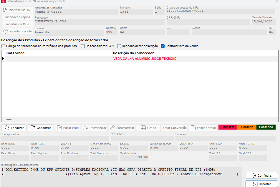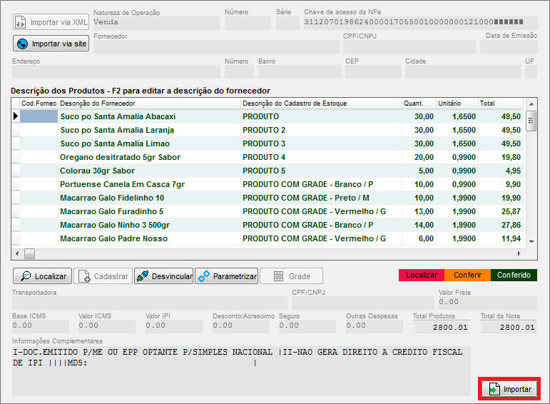Com os dados corretos, poderá Importar o XML, conferir todos os dados da Nota de Compra e Finalizar a mesma.
