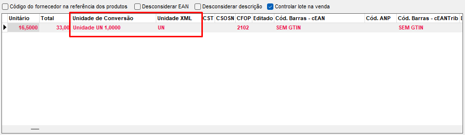 É importante destacar que o sistema vai informar qual unidade está sendo aplicada em comparação com a unidade original que veio no XML.
