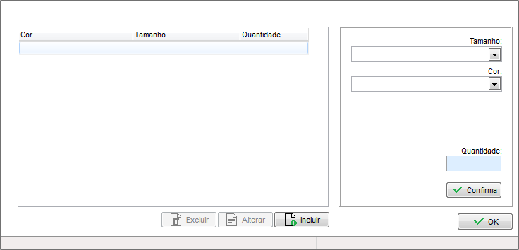 Nesta tela, deverá distribuir seus produtos selecionando o Tamanho, Cor e Quantidade.