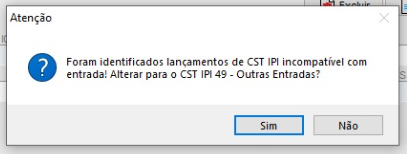 Ocorre quando o CST IPI está incompatível, o sistema vai sugerir o lançamento do 49 - Outras entradas, lembrando que só vai apresentar a mensagem se o CST IPI não for compatível com entradas e ocorre para evitar erros no SPED fiscal.
