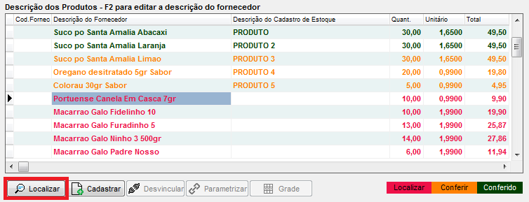 OBS: Antes de cadastrar o produto, é possível também alterar a descrição do fornecedor. Selecione o produto e pressione a tecla F2 para editar a descrição do fornecedor, após, ao clicar em Cadastrar, o produto será cadastrado em seu estoque com a descrição informada.