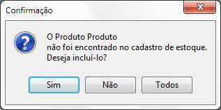 Em seguida será apresentada a tela informando se deseja cadastrar somente o item que não foi vinculado ou cadastrado, e se caso tiver mais de um item sem vínculo com algum produto também poderá cadastrar todos de uma vez, apenas clicando no botão Todos.