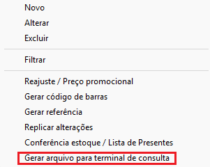 Para gerar o arquivo, basta acessar o Módulo de Estoque - Menu Editar - Gerar arquivo para terminal de consulta.