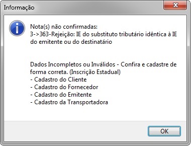 Rejeição 363: IE do Substituto Tributário idêntica à IE do emitente ou do destin