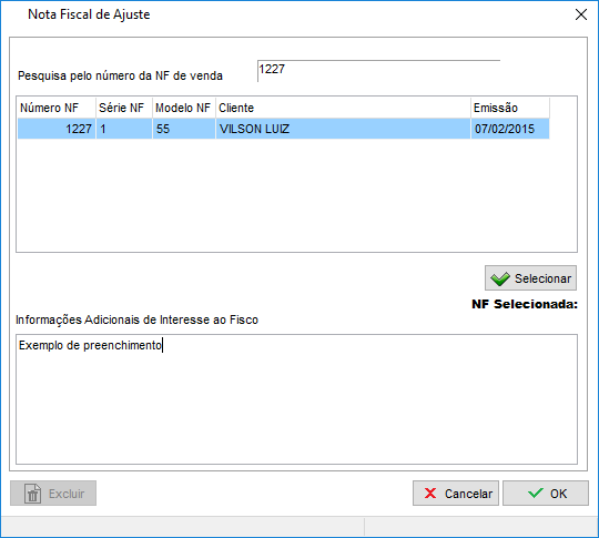 - Na tela de Nota Fiscal de Ajuste apresentada, insira a numeração da NF de Venda, clique na opção Selecionar, insira as Informações Adicionais de Interesse ao Fisco (este campo é obrigatório, no caso de dúvidas sobre o preenchimento, solicite auxilio de sua contabilidade), e após pressione OK para gravar a informação.