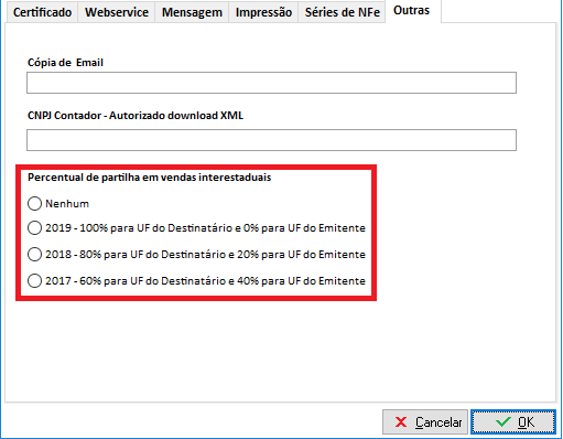 - Abra o Gerenciador de NFe, vá em Opções - Configurar e verifique se na aba Outras o percentual de partilha em vendas interestaduais está marcado com base no ano corrente.