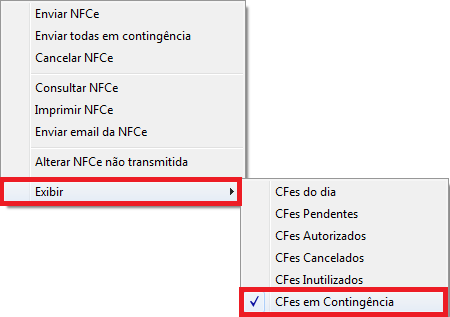 Em seguida, para visualizar as NFC-es emitidas em Contingência, clique com o botão direito do mouse na relação de notas apresentadas, vá em Exibir e clique na opção CFes em Contingência.