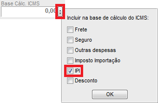 Após lançar os itens, caso seja necessário acrescentar o valor do IPI à Base de Cálculo do ICMS na nota de compra, deve-se clicar no botão de configurações da Base de Cálculo de ICMS [:], junto ao campo próprio de Base de Cálculo de ICMS, e marcar a opção IPI, conforme imagem: