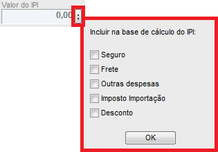 Caso após realizar o lançamento dos dados do IPI, o valor do mesmo permaneça incorreto, deve ser verificado se na nota recebida do seu fornecedor outros valores não foram inclusos na Base de Cálculo do IPI. Caso tenham sido, os mesmos também devem ser inclusos na Base de Cálculo do lançamento da nota de compra no seu Clipp Pro. Para isso, dentro do lançamento da nota de compra, em Cálculo dos Impostos, clique no botão [:] ao lado do campo Valor do IPI e selecione os valores necessários.