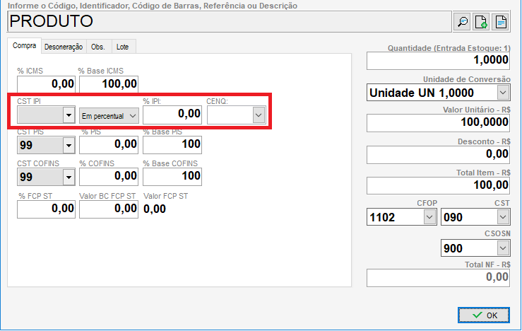 Para que o valor do IPI, seja calculado e somado ao total da nota fiscal de compra, o percentual ou o valor do IPI, o CST IPI e o CENQ devem ser informados no momento da inclusão dos produtos na nota fiscal de compra, conforme imagem: