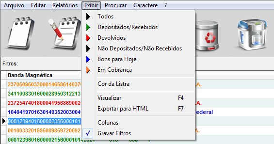 O menu Exibir permite realizar filtros rápidos exibindo todos os cheques de acordo seus Status: