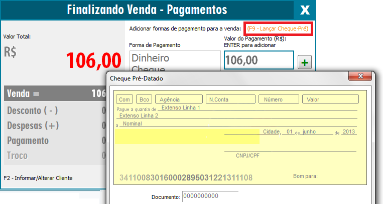 Ao finalizar a venda no Cupom Fiscal, para efetuar o lançamento do cheque, deve lançar o valor na forma de pagamento “Cheque”, enquanto o cursor ainda estiver neste campo, pressione F9 para lançar o cheque: