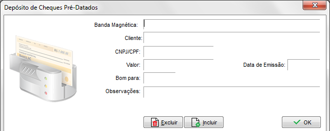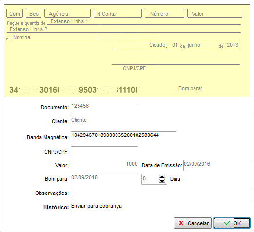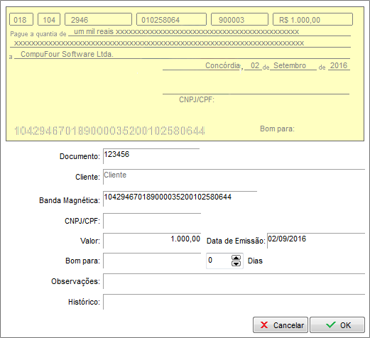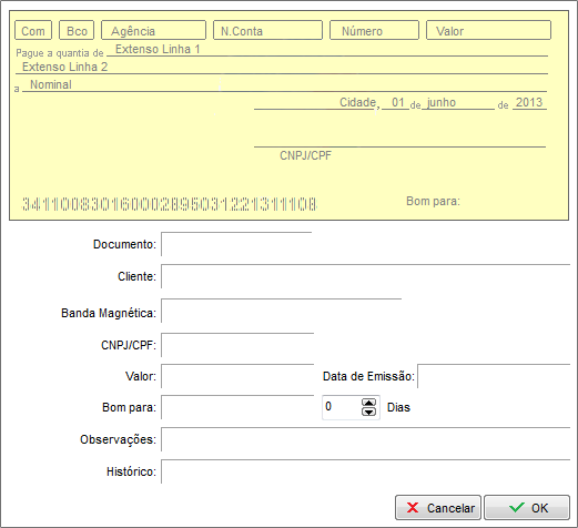 Digite o número/código CMC7 (Caracteres Magnéticos Codificados em 7 barras) no campo “Banda Magnética” ou passe o cheque no leitor de cheques. Após lançar a banda magnética e os demais dados clique em OK.