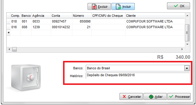Ao concluir o lançamento de todos os cheques a depositar, clique em Incluir novamente para que seja solicitado o Banco.