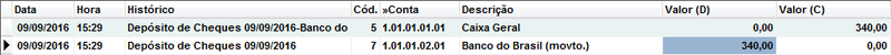 Efetuado um depósito em Banco é registrada uma saída no caixa com o valor da soma dos cheques e uma entrada para o banco informado.