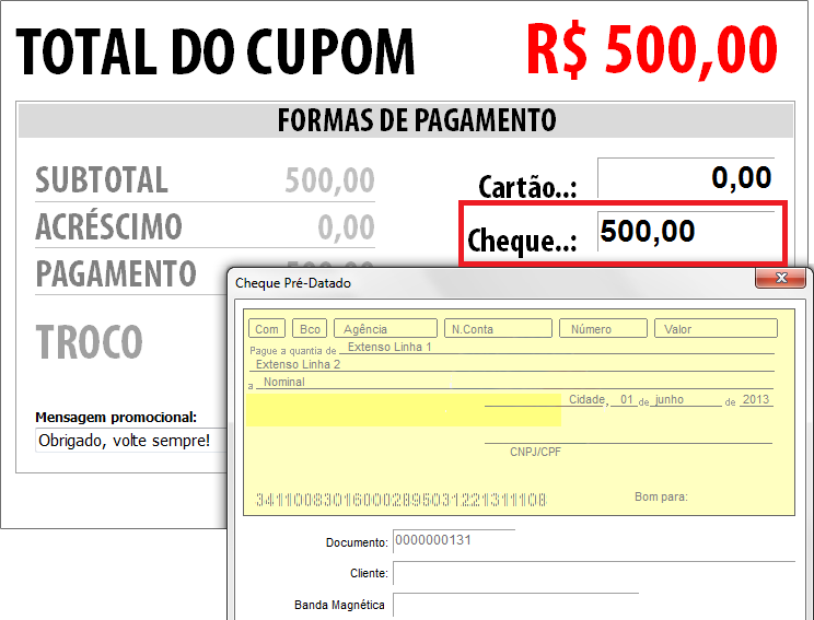 Digite o número/código CMC7 (Caracteres Magnéticos Codificados em 7 barras) no campo Banda Magnética ou passe o cheque no leitor de cheques;