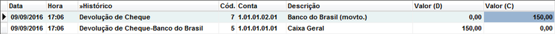 Efetuado uma devolução é registrada uma entrada no caixa com o valor do cheque e do Banco é abatido o valor do cheque devolvido.