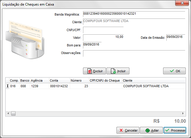 Ao clicar em Processar será exibida a tela onde se pode efetuar o lançamento do cheque. Para fazer a identificação do cheque deverá digitar a banda magnética ou passar o cheque no leitor de cheques: