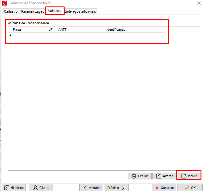 Quanto a aba Veículos, através do botão Incluir é possível realizar o preenchimento dos dados referentes aos veículos da transportadora. Neste momento deverá preencher a Placa, a UF, o Código ANTT e caso quiser, a Identificação, que pode ser utilizada para informar o nome do motorista responsável por aquele veículo ou até mesmo informar qual o veículo utilizado.