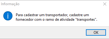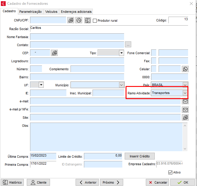 Neste momento será aberta a janela de cadastro, para que o cadastro seja identificado como uma transportadora, basta selecionar no campo Ramo de Atividade a opção Transportes conforme imagem a seguir:
