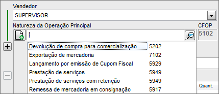 O sistema possui na base de dados algumas Naturezas de Operação já cadastrados. Caso precisar cadastrar uma outra natureza de operação específica, poderá clicar no botão de Novo Cadastro à esquerda do campo (essa opção também pode ser acionada através da tecla Insert), ou através do cadastro de Naturezas de Operação, para verificar o procedimento, clique aqui.