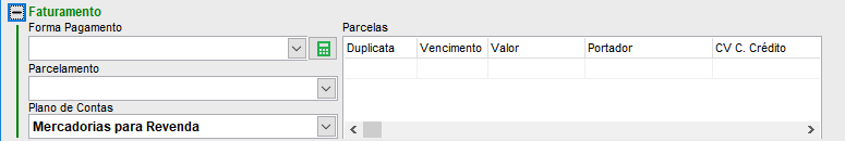 Após isso, deve selecionar a opção de Fatura e Parcelamento, isso influenciará na geração da movimentação financeira, não existindo essa movimentação para seu caso, selecione Nenhum para as duas opções.
