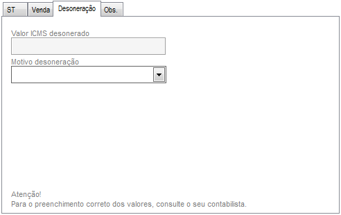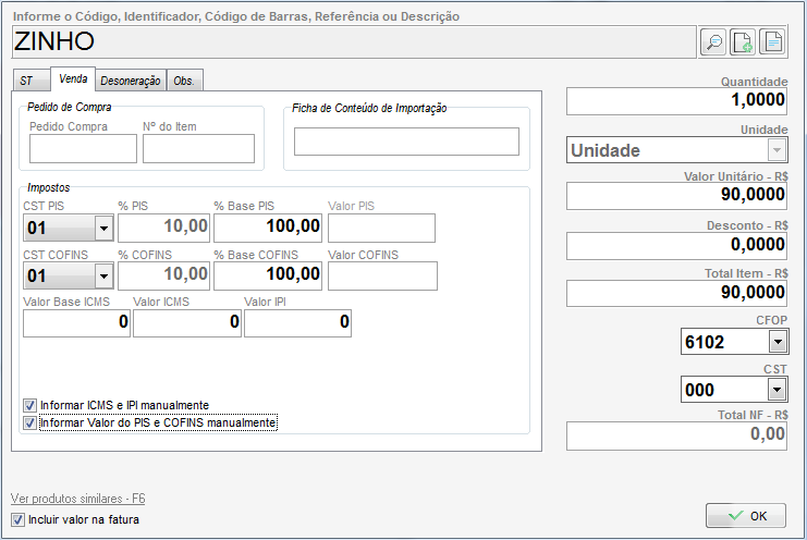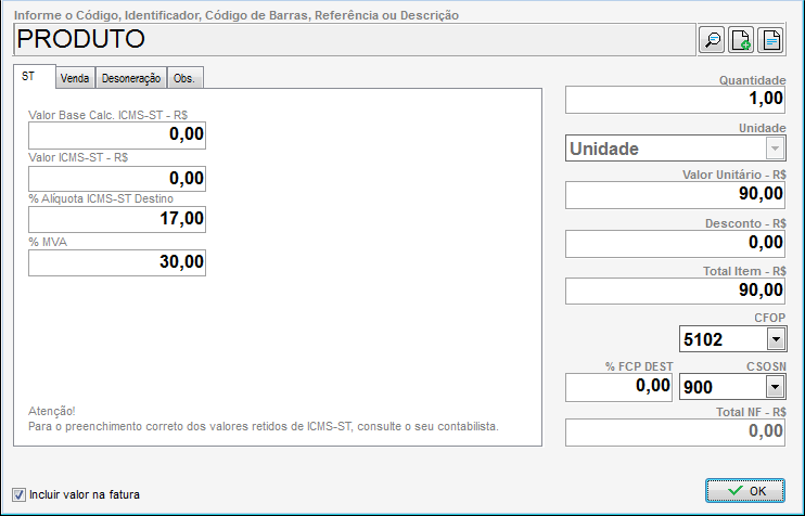 Ao selecionar um produto, serão apresentadas as abas ST (caso o campo % MVA estiver preenchido no estoque), Venda, Desoneração e Obs.