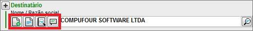 O próximo passo é preencher o Destinatário buscando um cliente cadastrado. Informe o nome do cliente ou seu CNPJ/CPF e pressione a tecla Enter, em seguida, caso forem apresentados mais de um resultado, basta selecionar o cliente correto. Ao lado do campo serão apresentados alguns botões para facilitar o controle de clientes, são eles: