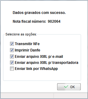 Realizados esses procedimentos, poderá finalizar a nota e em seguida marcar se deseja Transmitir / Imprimir DANFe / Enviar arquivo XML por e-mail para o cliente e também para a transportadora, marcando a opção Enviar link por whatsapp será enviado um link contendo as informações da nota para o whats do cliente.