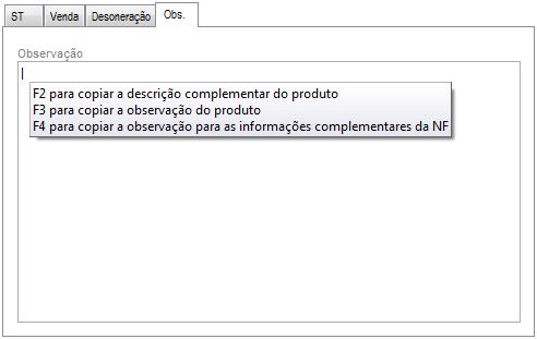 Dica: É possível realizar a importação da Descrição Complementar do produto para esse campo, para isso, basta pressionar a tecla F2. Também é possível importar o que está preenchido no campo de Observação do cadastro do produto pressionando a tecla F3. Existe também a possibilidade de importar a Observação do cadastro do produto para as Informações Complementares da nota que está sendo lançada, neste caso, deve ser pressionada a tecla F4 nesta tela.