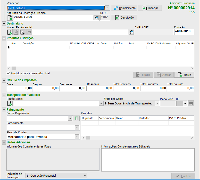 Em seguida, é possível definir um Vendedor para essa nota (somente estarão disponíveis nesse campo os Funcionários com a Função de Vendedor marcada em seu cadastro).