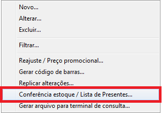 Para gerar o relatório de Lista de Presentes, acesse o Módulo de Estoque, vá até o menu Editar e clique em Conferência estoque/Lista de Presentes.