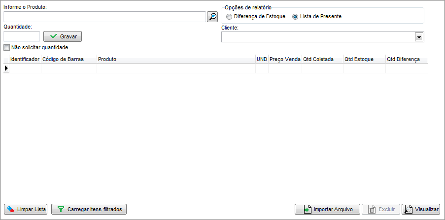 Marque a opção Lista de Presente nas Opções de Relatório. Em seguida, informe os produtos e as quantidades desejadas ou importe o arquivo do coletor de dados. Se desejar, informe o nome do Cliente. Feito isso clique em Visualizar.