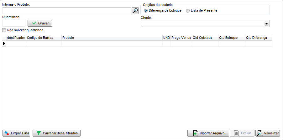 É possível realizar a importação do arquivo gerado por um Coletor de Dados, através do qual serão identificados os códigos de barras e as quantidades de seus produtos. Caso desejar buscar o arquivo gerado pelo coletor de dados, clique sobre o botão Importar Arquivo e localize o arquivo TXT, em seguida, serão exibidos os itens e suas quantidades no relatório.