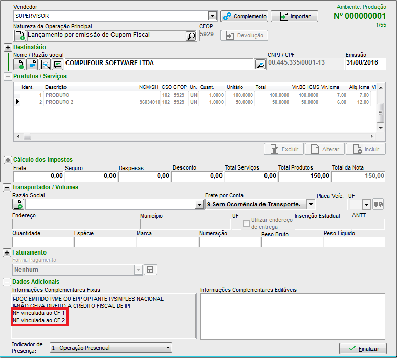 Confira todas as informações da nota e clique no botão Finalizar.