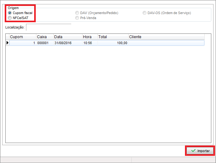Selecione a origem a qual se refere o documento fiscal, em seguida localize o mesmo e clique em Importar.
