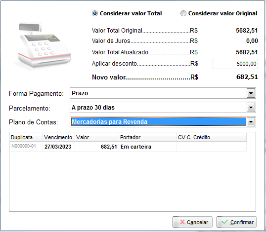 Será possível considerar o valor total (com os juros) ou o valor original sem os juros, no campo desconto aplique o valor que deseja descontar do total com base no filtro, em seguida informe a Forma de Pagamento e parcelamento, que poderá ser prazo ou cartão pois nova(s) parcela(s) terão que ser criadas.