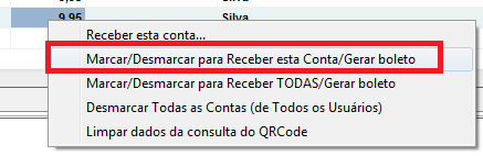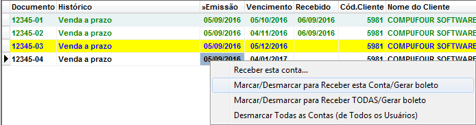 É possível também escolher várias contas e recebê-las de uma única vez. Clique com o botão direito do mouse sobre a conta a ser recebida e clique na opção “Marcar/Desmarcar para Receber esta Conta/Gerar Boleto”. A conta em questão irá ficar marcada na cor amarela. Marque ou desmarque quantas contas forem necessárias.